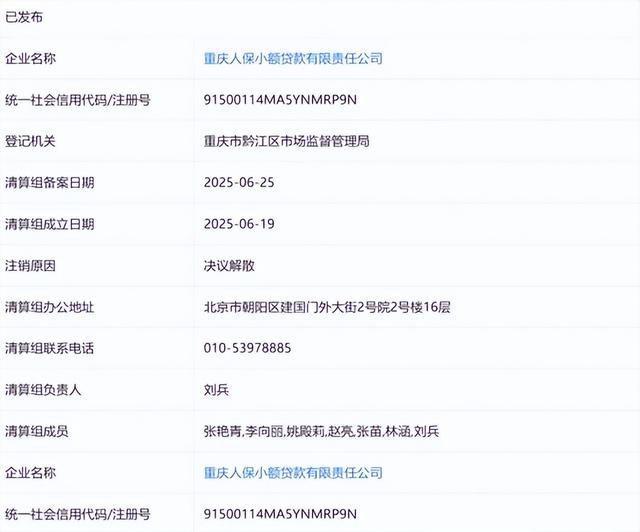 近日,企查查消息显示,2025年6月25日,重庆人保小额贷款有限责任公司(以下简称“人保小贷”)因决议解散,拟向公司/农民专业合作社登记机关申请注销登记,请债权人自公告之日起45日内向清算组申报债权。