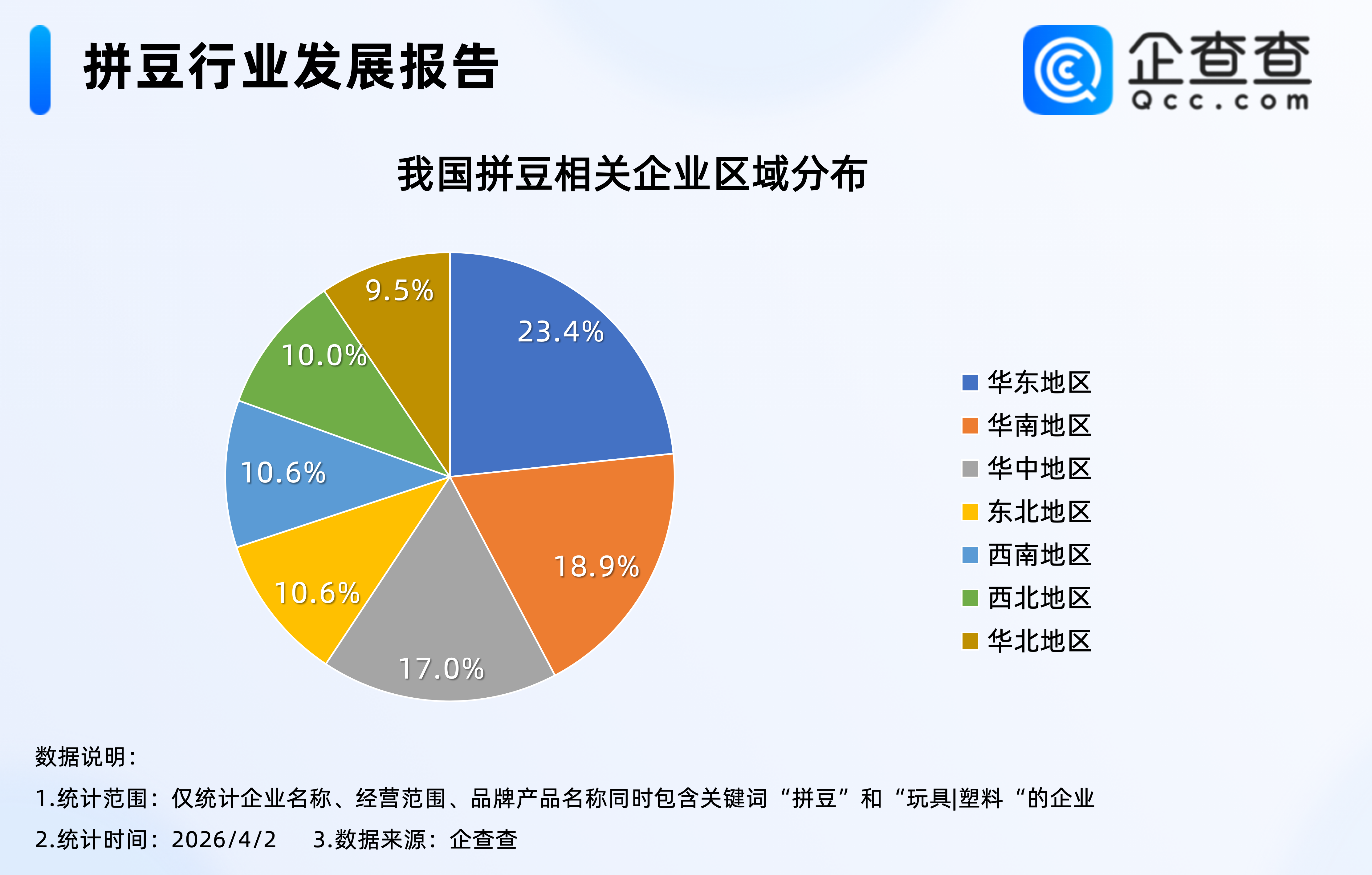企查查数据显示,2025年7月以来,我国累计注册683家拼豆相关企业,其中2026年3月全月注册384家。企业存量方面,截至2026年4月2日,我国现存698家拼豆相关企业,区域分布上,位于华东地区的相关企业最多,占比23.4%。