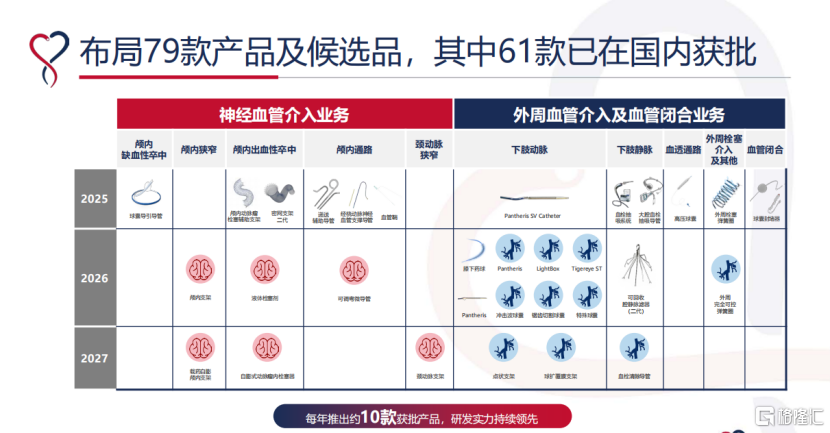 值得关注的是,公司的增长并非依赖单一爆款,而是产品矩阵的系统性放量。从成熟的颅内支持导管、弹簧圈、DCB球囊,到去年开始全面放量的血流导向装置,再到最新商业化的大腔外周血栓抽吸导管、颅内动脉瘤栓塞辅助支架……丰富的产品组合已形成梯次推进的增长格局。