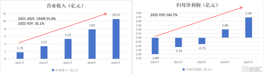 市场的热情并非空穴来风。近日,公司交出2025全年成绩单:营收首次突破十亿大关,达到10.57亿元,同比增长35.1%;海外收入增速达115.5%,收入规模逼近5000万元;净利润增速更是飙升143.7%,达到2.44亿元。在业绩发布后连续三个交易日,公司股价累计涨幅达到12.74%,表现强于低迷市场。这一组数据背后,究竟藏着怎样的增长逻辑?