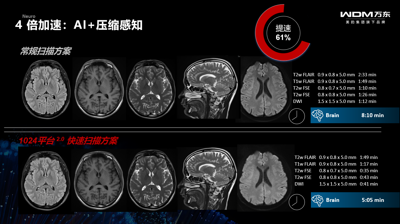 在磁共振领域,基于1024广域深度学习平台,图像去噪增强功能,显著提高图像的SNR和CNR,将常规头颅平扫速度提升61%,膝关节扫描速度提升50%,为临床高效检查提供新路径。