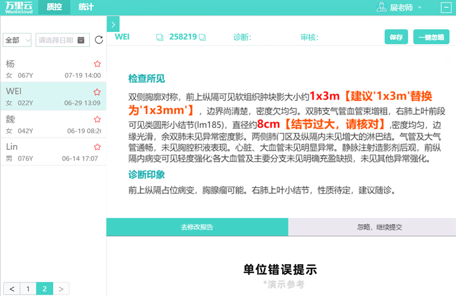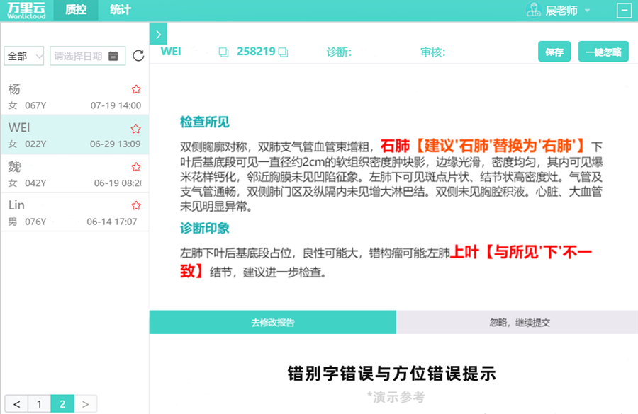 美的医疗业务板块下的万里云妙笔AI质控管理系统融合自研NLP模型、针对性训练调参的医疗大语言模型与影像AI知识库,构建覆盖超30类报告规范指标的动态核查、医理高阶校验、诊断差异比对与量化评分体系,以及主动式质控管理及科室数据统计体系,实现从事后抽查向事中实时干预的转变。