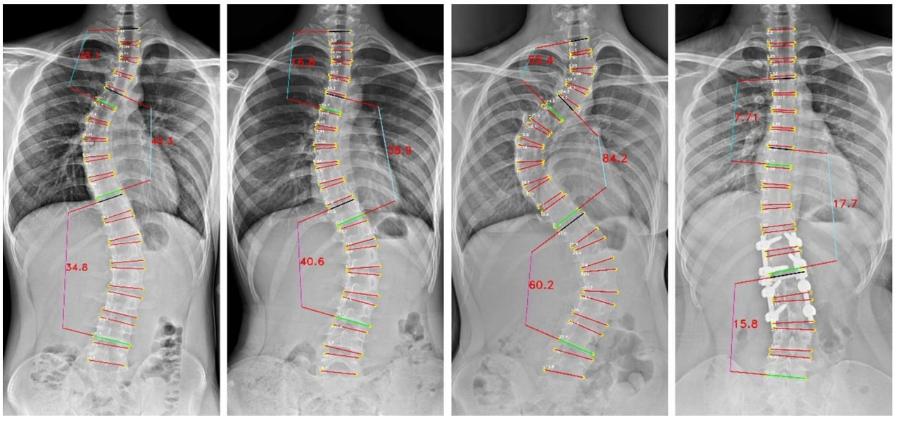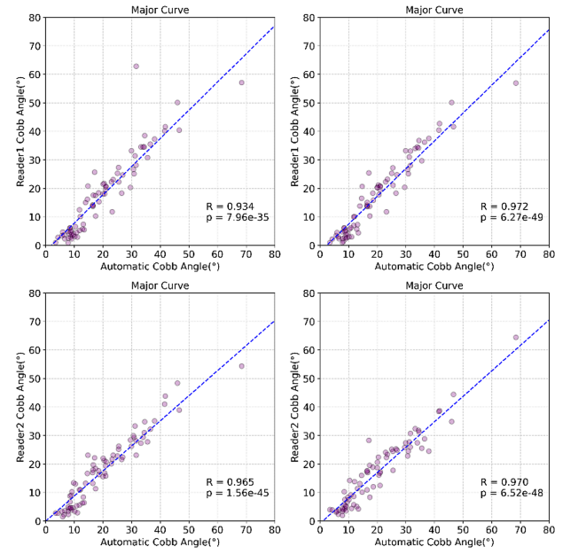 Cobb角是评估脊柱侧弯程度的"金标准",其测量结果可以用于评估病情、制定治疗计划和跟踪疾病进展。万东Cobb角自动测量系统,1秒内即可完成Cobb角计算,较传统手工测量(耗时>2 分钟)效率提升百倍。经研究验证,Cobb角平均测量误差仅3.918°,ICC为0.943,验证了该算法技术指标顶尖、误差小、重复性极好,相关论文收录于脊柱外科和脊柱研究领域的国际顶级期刊之一《European Spine Journal》。