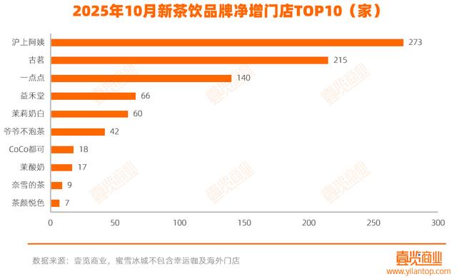 从净增门店看,10月共有11个品牌实现正增长。其中,沪上阿姨成为10月净增门店数量最多的品牌,净增271家;一点点则成为10月增速最快的品牌,净增140家,环比增长3.59%,门店规模突破4000家。
