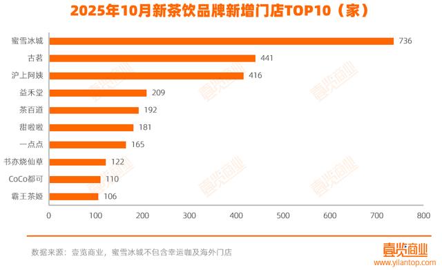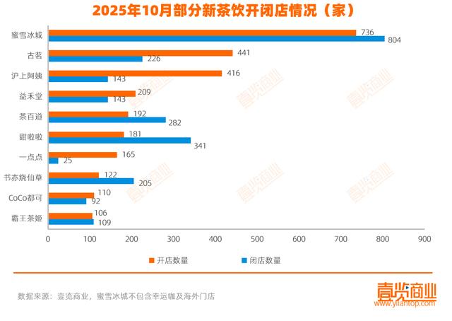 2025年10月,新茶饮行业整体拓店节奏放缓。壹览商业监测的30个连锁品牌合计现有门店总量13.38万家,单月新开3247家、关闭3062家,净增长186家,环比增长0.14%。