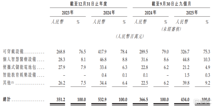按产品应用场景产生的收入划分,2023年、2024年、2025年1-9月(简称“报告期”),公司75%以上的收入来自可穿戴设备领域,个人智慧医疗设备领域贡献了约10%的收入,便携式储能电池包、智能教育娱乐设备等业务收入占比很低。