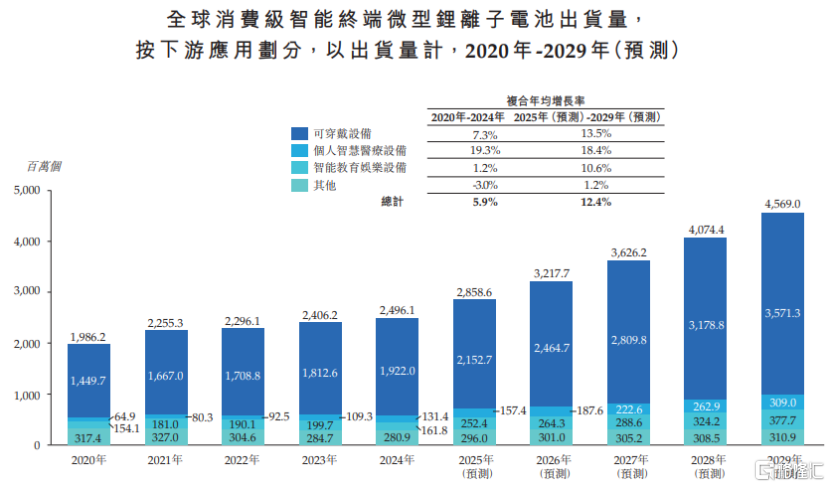 在全球消费级智能终端便携化趋势带动下,微型锂离子电池的市场需求持续增长。2024年全球消费级智能终端微型锂离子电池出货量约24.96亿个,预计2025年至2029年的复合年均增长率约12.4%。