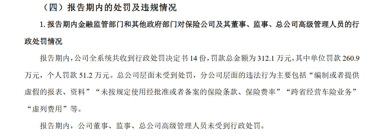 合规方面,报告期内华安财险全系统共收到14份行政处罚决定书,罚款总金额312.1万元,其中单位罚款260.9万元,个人罚款51.2万元。总公司层面未收到处罚,分公司层面违法行为主要包括“编制或者提供虚假的报表、资料”“未按规定使用经批准或者备案的保险条款、保险费率”“跨省经营车险业务”“虚列费用”等。