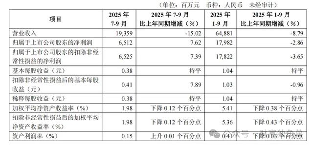 据华夏银行2025年第三季度报告,截至今年9月末,其实现营业收入648.81亿元,同比下降8.79%;归母净利润179.82亿元,同比下滑2.86%。