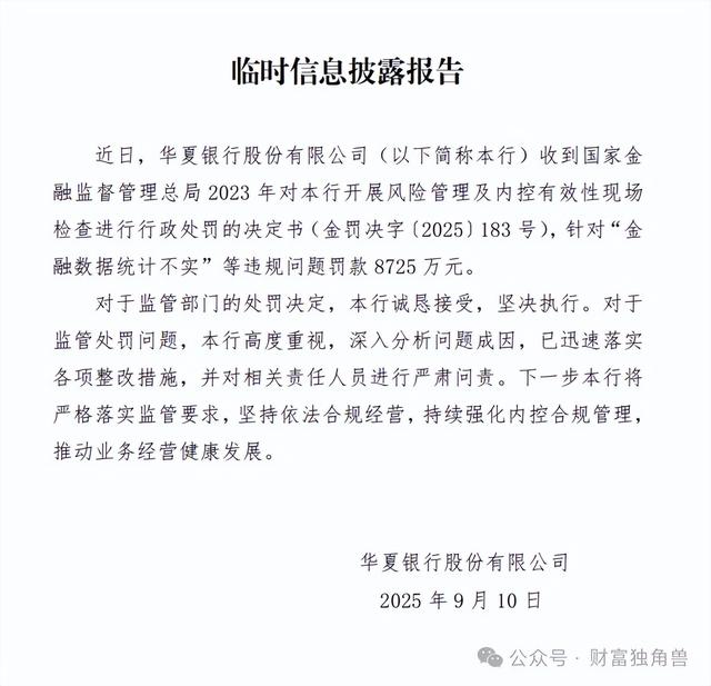 9月10日,华夏银行发布临时信息披露报告称,“华夏银行股份有限公司(以下简称本行)收到国家金融监督管理总局 2023 年对本行开展风险管理及内控有效性现场检查进行行政处罚的决定书(金罚决字〔2025〕183 号),针对‘金融数据统计不实’等违规问题罚款8725 万元。”