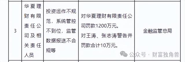 9月12日,华夏银行旗下华夏理财有限责任公司及相关责任人员因“投资运作不规范,系统管控不到位,监管数据报送不合规等”等原因,被金融监管总局对华夏理财有限责任公司罚款1200万元。对王某、张某某警告并罚款合计10万元。