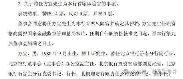 方宜,被聘任为华夏银行首席风险官。曾任北京银行济南分行副行长,北京银行董事会(监事会)办公室副主任,北京银行投资管理部副总经理,北京银行石家庄分行党委书记、行长,北银理财有限责任公司党委书记、董事长。
