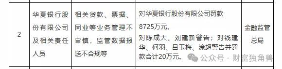 就华夏银行而言,2025年9月5日,国家金融监督管理总局行政处罚信息公示列表显示,华夏银行股份有限公司及相关责任人员,因“相关贷款、票据、同业等业务管理不审慎,监管数据报送不合规等”,金融监管总局对华夏银行股份有限公司罚款8725万元。对陈某某、刘某某警告;对钱某某、何某、吕某某、涂某警告并罚款合计20万元。