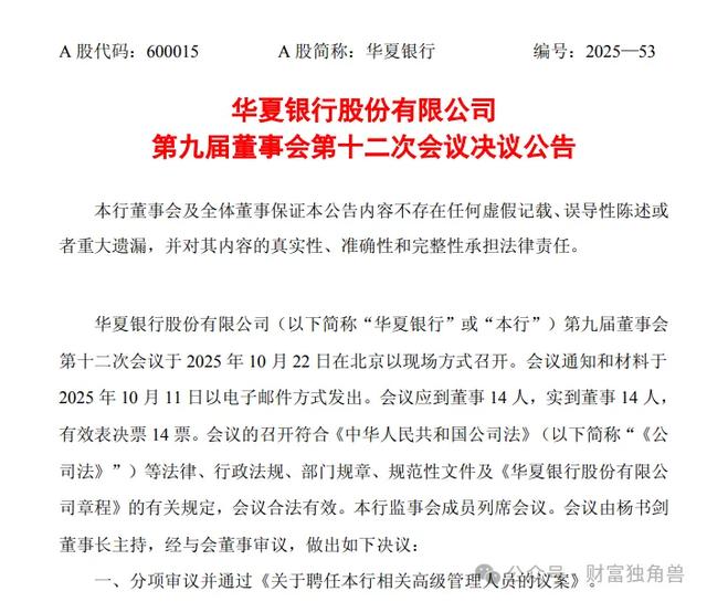 2025年10月22日,华夏银行召开的第九届董事会第十二次会议,审议并通过了多项议案。其中,关于高级管理人员的聘任成为关注重点,董事会通过了三项人事任命,涉及首席运营官、首席风险官、首席财务官三个关键岗位。