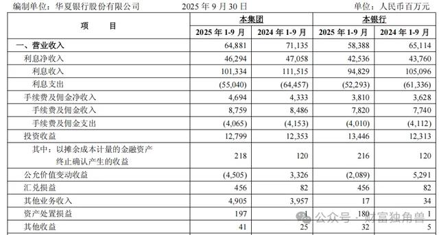 在投资端,截至今年9月末,华夏银行公允价值变动收益为-45.05亿元,而2024年同期为33.26亿元。