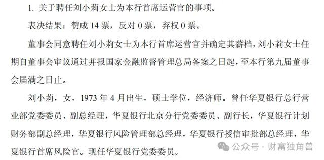 其中,刘小莉被聘任为华夏银行首席运营官。曾任华夏银行总行营业部党委委员、副总经理,华夏银行北京分行党委委员、副行长,华夏银行计划财务部副总经理,华夏银行风险管理部总经理,华夏银行授信审批部总经理,华夏银行首席风险官。现任华夏银行党委委员。