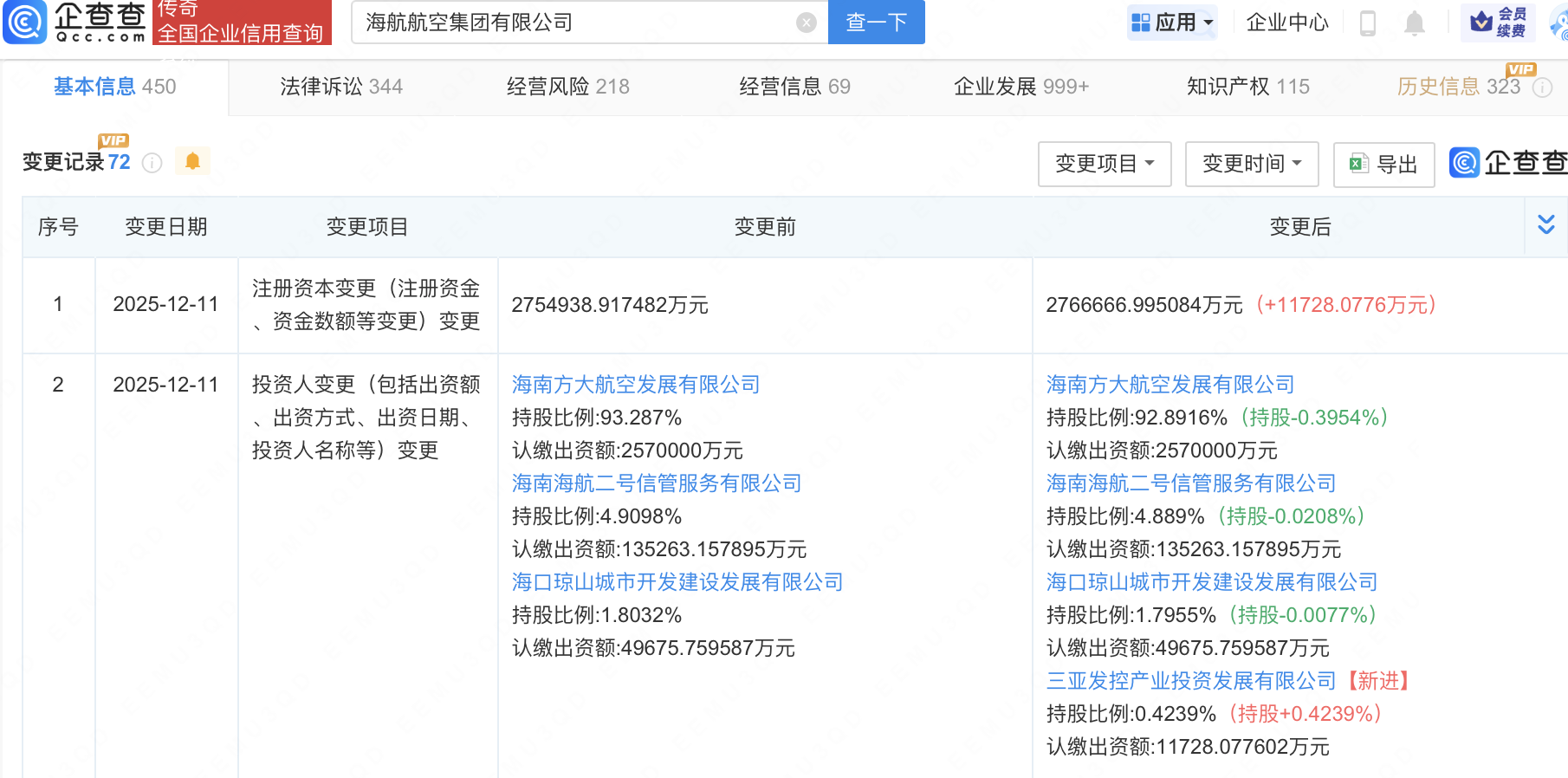 企查查APP显示,近日,海航航空集团有限公司发生工商变更,新增三亚发控产业投资发展有限公司为股东,同时注册资本增至约276.7亿元。企查查信息显示,该公司成立于2009年,经营范围包含:智能无人飞行器销售;人工智能公共服务平台技术咨询服务等,目前大股东为海南方大航空发展有限公司,持股92.89%。