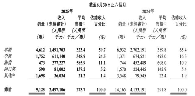 核心品类珍酒品牌2025年上半年营收14.92亿元,同比近乎腰斩,呈现典型的“量价齐跌”态势—销量从去年同期的6932吨降至4612吨,平均售价也从38.98万元/吨下滑至32.34万元/吨。