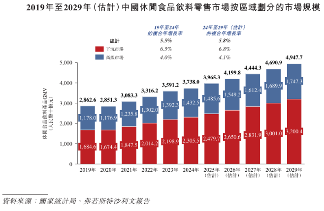 量贩零食赛道的崛起,恰逢休闲食品市场的黄金发展期。弗若斯特沙利文数据显示,2024年中国零食饮料整体市场规模达4.0万亿元,预计2029年将增至4.95万亿元,2024-2029年复合增速5.8%;其中量贩零食渠道增速迅猛,预计同期复合增速达36.5%,2029年市场规模将达6137亿元,渗透率提升至11.4%。