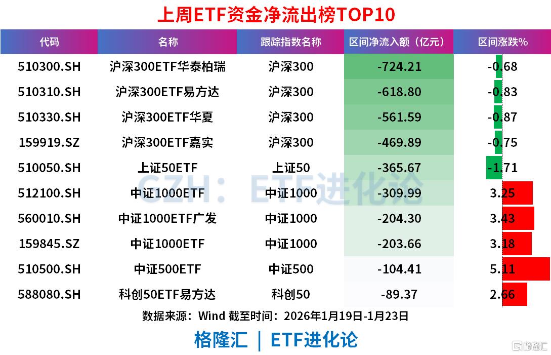 沪深300ETF华泰柏瑞、沪深300ETF易方达、沪深300ETF华夏、沪深300ETF嘉实、上证50ETF、中证1000ETF上周分别净流出724.21亿元、618.80亿元、561.59亿元、469.89亿元、365.67亿元、309.99亿元。
