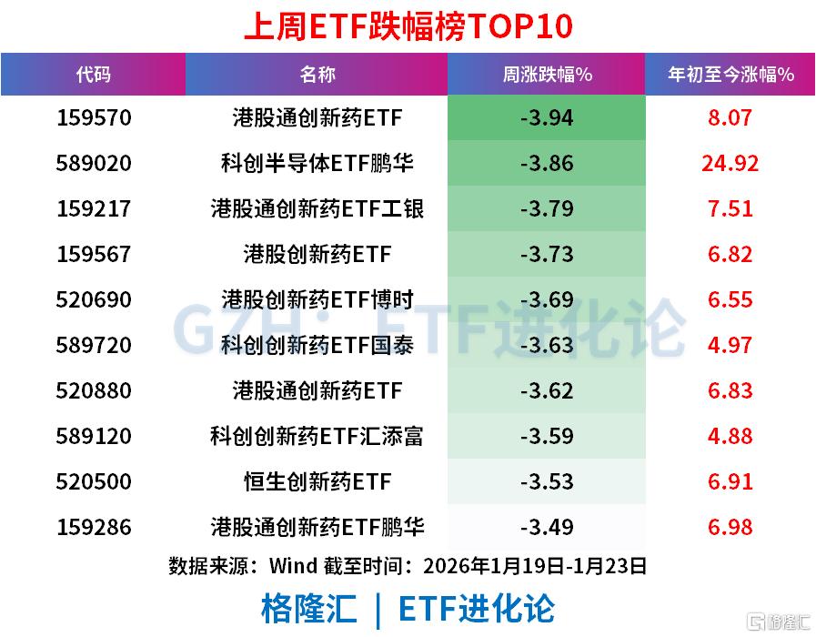 港股通创新药ETF、科创半导体ETF鹏华、港股通创新药ETF工银、港股创新药ETF、港股创新药ETF博时、科创创新药ETF国泰、港股通创新药ETF上周分别跌3.94 %、3.86 %、3.79 %、3.73 %、3.69 %、3.63 %、3.62 %。