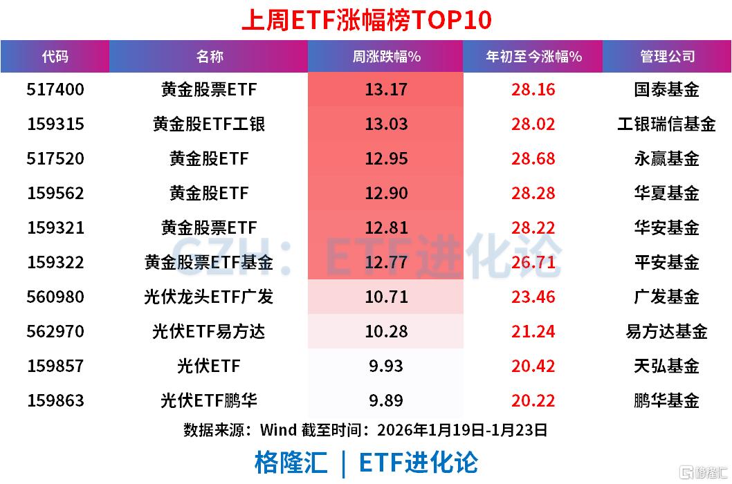 黄金股票ETF、黄金股ETF工银、黄金股ETF、黄金股ETF、黄金股票ETF、黄金股票ETF基金、光伏龙头ETF广发、光伏ETF易方达上周分别涨13.17 %、13.03 %、12.95 %、12.90 %、12.81 %、12.77 %、10.71 %、10.28 %。