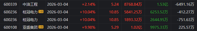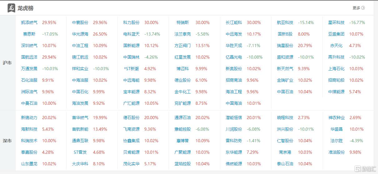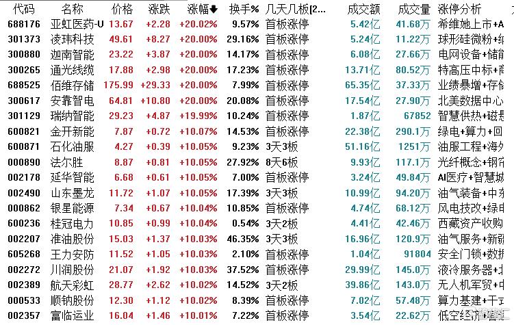 焦点股方面,法尔胜反包涨停走出8天6板,洲际油气7天5板,亚盛集团水发燃气4连板,石化油服、山东墨龙3连板,金开新能东方锆业4天2板,桂冠电力航天彩虹3天2板,佰维存储德明利等涨停。