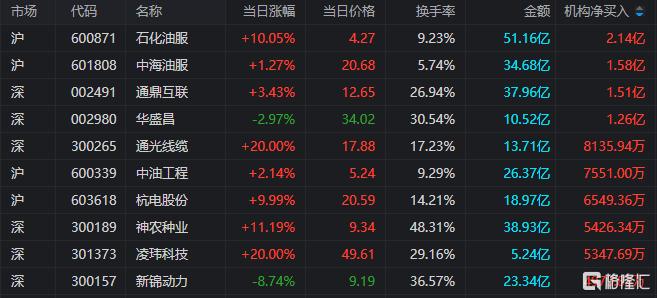 龙虎榜中涉及机构专用席位的个股中,当日净买入额前三为石化油服、中海油服、通鼎互联,分别为2.14亿元、1.58亿元、1.51亿元。