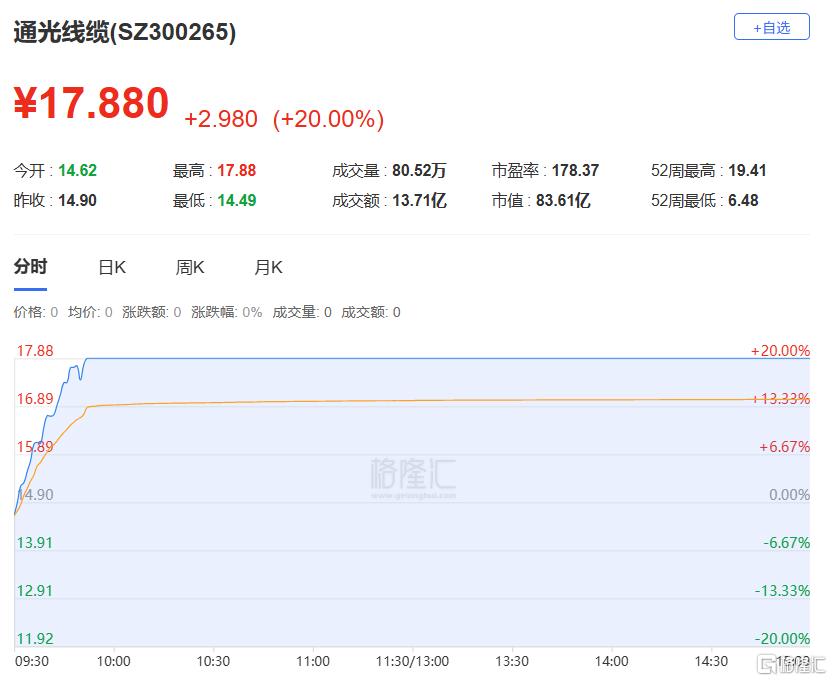 通光线缆:今日20%涨停,偏离值20.00%,换手率17.23%,成交额13.71亿。龙虎榜数据显示,机构净买入8135.94万元。