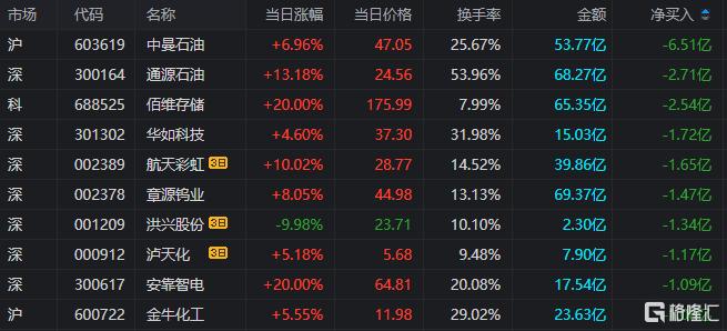 龙虎榜单日净卖出额前三为中曼石油通源石油、佰维存储,分别为6.51亿元、2.71亿元、2.54亿元。