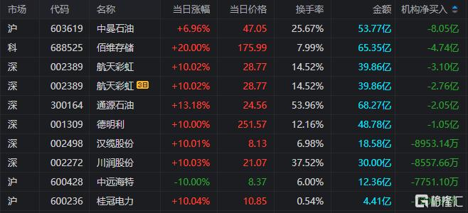 龙虎榜中涉及机构专用席位的个股中,当日净卖出额前三为中曼石油、佰维存储、航天彩虹,分别为8.05亿元、4.74亿元、3.10亿元。