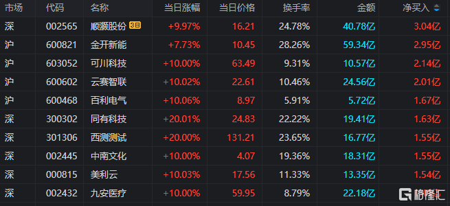 龙虎榜单日净买入额前三为金开新能、可川科技、云赛智联,分别为2.95亿元、2.14亿元、2.01亿元。