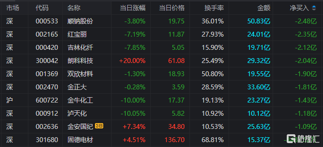 龙虎榜单日净卖出额前三为顺钠股份、红宝丽、吉林化纤,分别为2.48亿元、2.35亿元、2.12亿元。