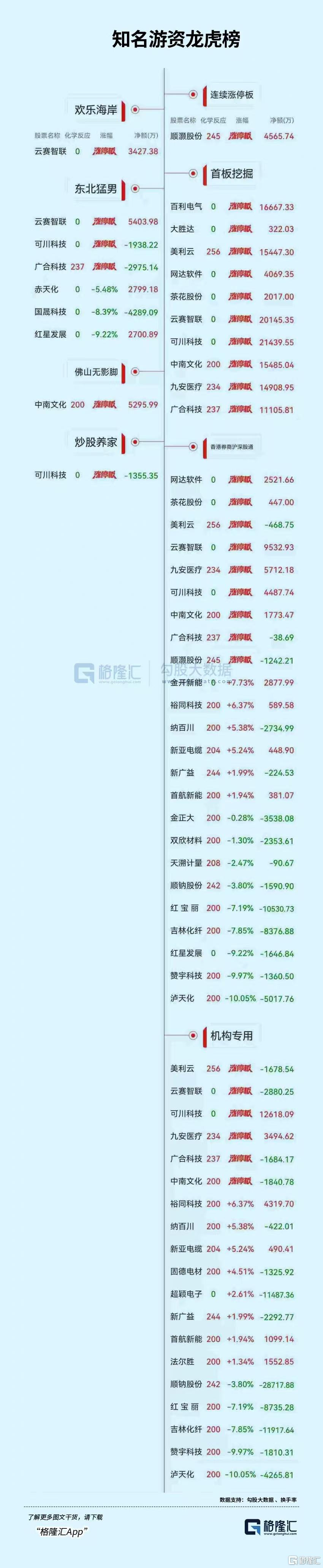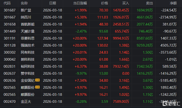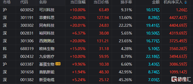 龙虎榜中涉及机构专用席位的个股中,当日净买入额前三为可川科技、菲菱科思、同有科技,分别为1.26亿元、4427.42万元、4404.69万元。