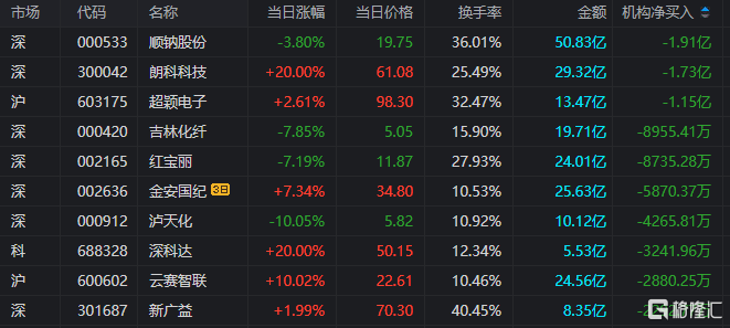 龙虎榜中涉及机构专用席位的个股中,当日净卖出额前三为顺钠股份、朗科科技、超颖电子,分别为1.91亿元、1.73亿元、1.15亿元。