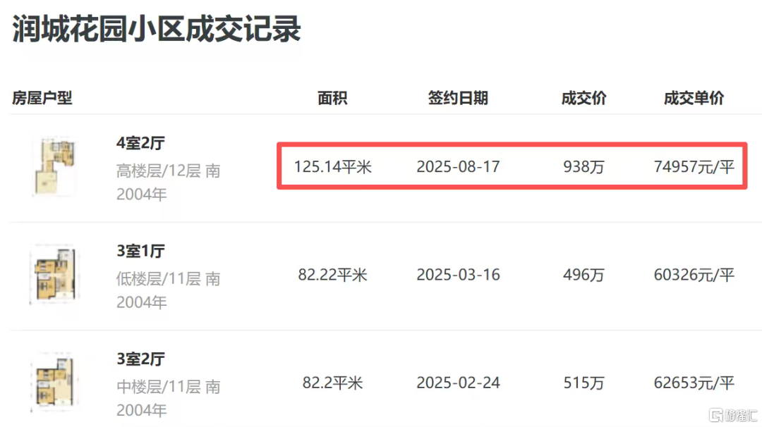 润成花园今年8月成交一套125.14平户型成交总价为938万,折合单价约7.5万/平;