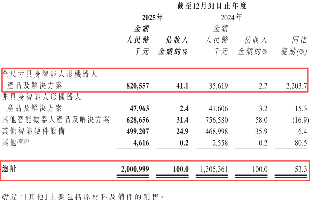 其中,全尺寸具身智能人形机器人产品(非遥控非玩具,身高160cm以上)及解决方案收入约8.21亿元,同比暴增2203.7%,销量达到1079台。