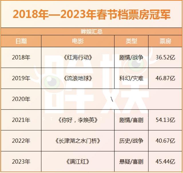 而剩下三年春节档票房首位,则由完全不掺杂任何喜剧元素的战争题材电影与科幻题材电影占据。其中,2023年第二名《流浪地球2》与第一名《满江红》票房差距并不算大,并且由于是《满江红》票房夺冠,在当年还引发过不小的舆论争议。