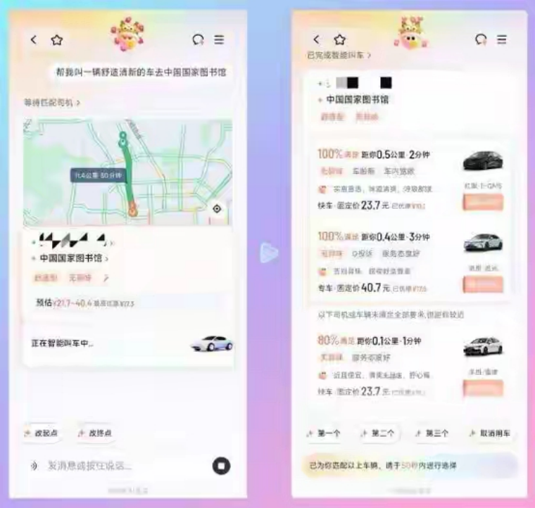 从2012年移动互联网井喷发展以来,网约车行业发展了十余年,用户的叫车流程其实一直没有发生根本性的改变。从最开始的电话叫车,到后来的APP下单,用户始终需要手动完成输入地址、选择车型、确认订单等一系列操作,哪怕是语音叫车,也大多停留在语音转文字的基础阶段,只能处理最简单的点对点叫车需求。