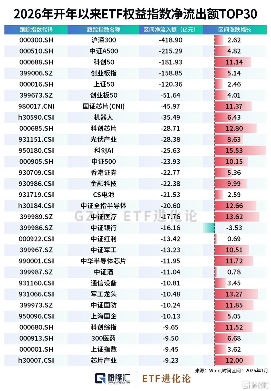 1月15日,净流出前十的ETF全部是宽基ETF,合计净流出额达715亿元,其中沪深300ETF华泰柏瑞单日净流出200亿。