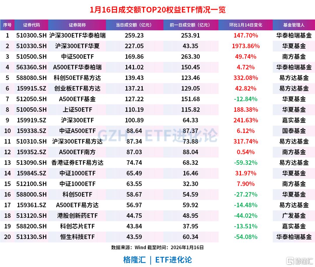 科创50ETF易方达、上证50ETF和沪深300ETF成交额均较1月13日放量超100%。