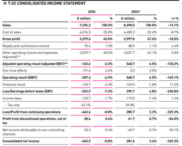 更值得关注的是成本费用的刚性。2025年公司运营支出(不含一次性影响)维持在约35亿欧元,与上年持平。尽管管理层试图通过效率计划控制成本,但Markus Neubrand在电话会中强调,公司并未刻意进一步削减营销开支,而是将其视为提升品牌形象的关键杠杆。这意味着,在销售额下滑的背景下,刚性支出反而推高了费用占比,公司运营支出比率上升了640个基点至48.5%。