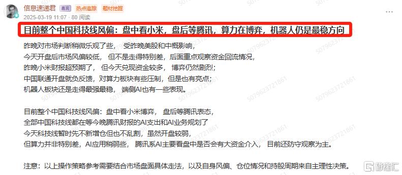 今天由于昨晚中概回调,小米表现相对也一般,A股缩量调整,整个科技线风偏转弱明显,不过我们圈子也强调了盘中看小米表现,盘后等腾讯财报和AI展望给大家答案。