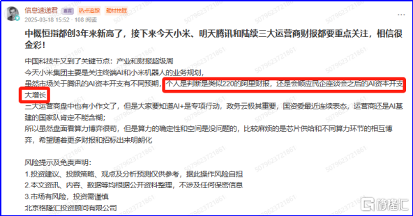 我们自己根据已经了解到的市场公开信息,精准研判到腾讯的业绩和AI展望都会大概率超预期,圈子里的相关提前布局标的也都顶住了回调压力,静待腾讯揭晓答案,相信明天科技先风偏回归在即,明天开始就是我们圈友的收获日了!