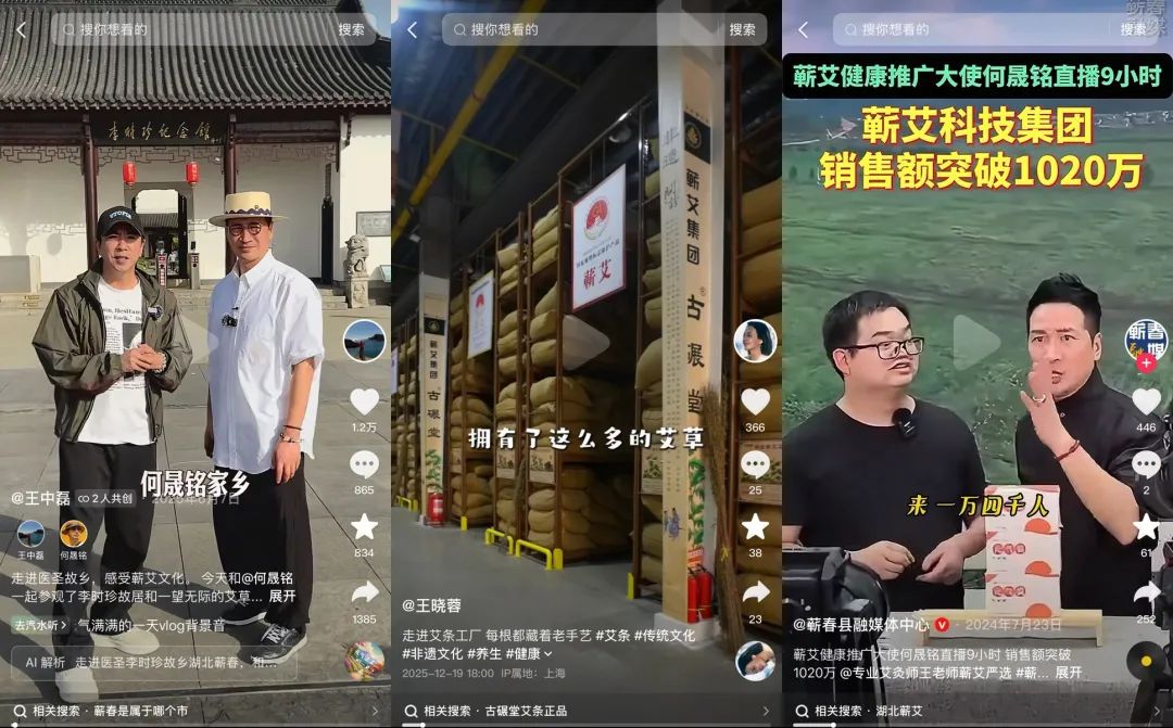 实际上,早在2025年4月,王忠磊就曾参观湖北蕲艾集团,随后发布多条当地艾草产业相关的短视频。其短视频账号显示,王忠磊还曾拉上艺人何晟铭参观位于湖北蕲春的李时珍故居,并在当地买了一个小院。值得一提的是,何晟铭作为蕲艾健康推广大使曾在2024年带货蕲艾集团的产品,9小时销售额破千万。