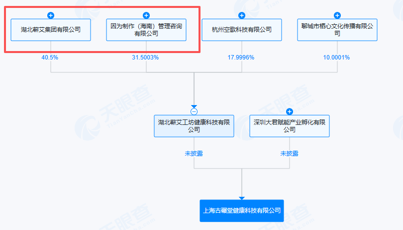 天眼查信息显示,上海古碾堂健康科技有限公司成立于2025年11月,该公司与王晓蓉并无直接股权关联。但王晓蓉曾担任高管的因为制作(海南)管理咨询有限公司通过湖北蕲艾工坊健康科技有限公司持有古碾堂的部分股份(未披露具体份额)。