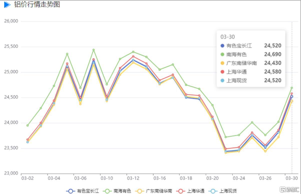 3月30日,长江有色均价报24520元/吨,涨700元;上海有色网铝价更是飙升720元/吨,触及24530元/吨;广东南储均价报24430元/吨,领涨710元。