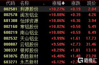 港A铝业股全线走高。A股中,利源股份、闽发铝业、怡球资源、常铝股份、南山铝业、天山铝业6股涨停,云铝股份、鼎胜新材等跟涨。