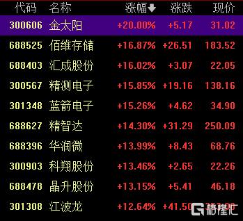 个股中,金太阳20CM涨停,佰维存储、精测电子涨超16%,汇成股份、蓝箭电子涨超9%,晶升股份涨超13%。值得注意的是,佰维存储、精测电子、汇成股份、江波龙、华海清科创历史新高。