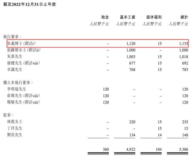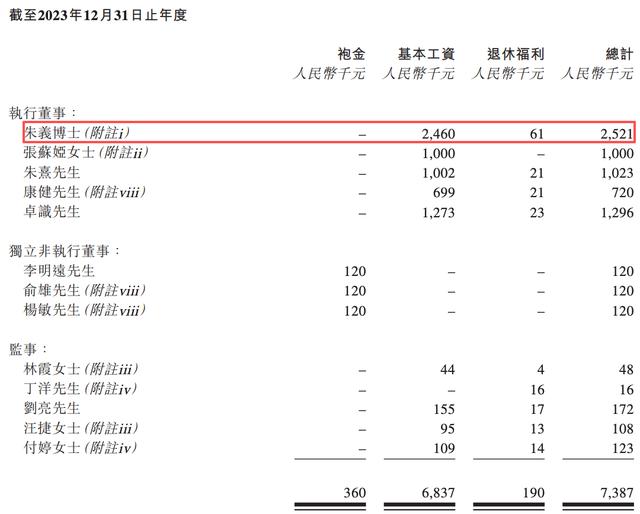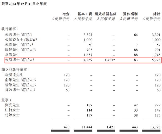 同样,朱义之子朱海,作为百利天恒执行董事(于2024年2月被委任为董事)的工资更高一筹。2024年度,朱海从百利天恒取得基本工资426.9万元。同年,取得绩效相关花红142.1万元,退休福利8.3万元,总计取得薪酬577.3万元。